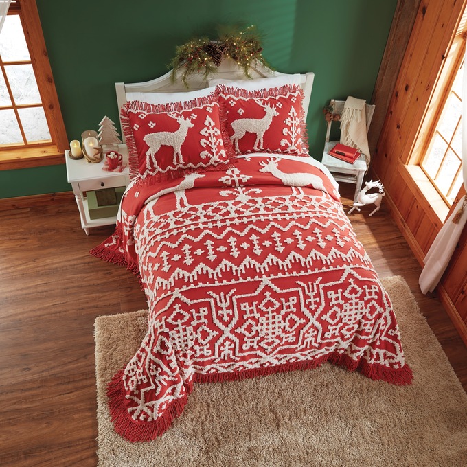 Make your holidays merry with cozy Fair Isle bedspread. Red chenille with reindeer and geometric design in warm white tufting. Twisted edge fringe; reverses to solid woven back. Cotton; machine wash. Imported.