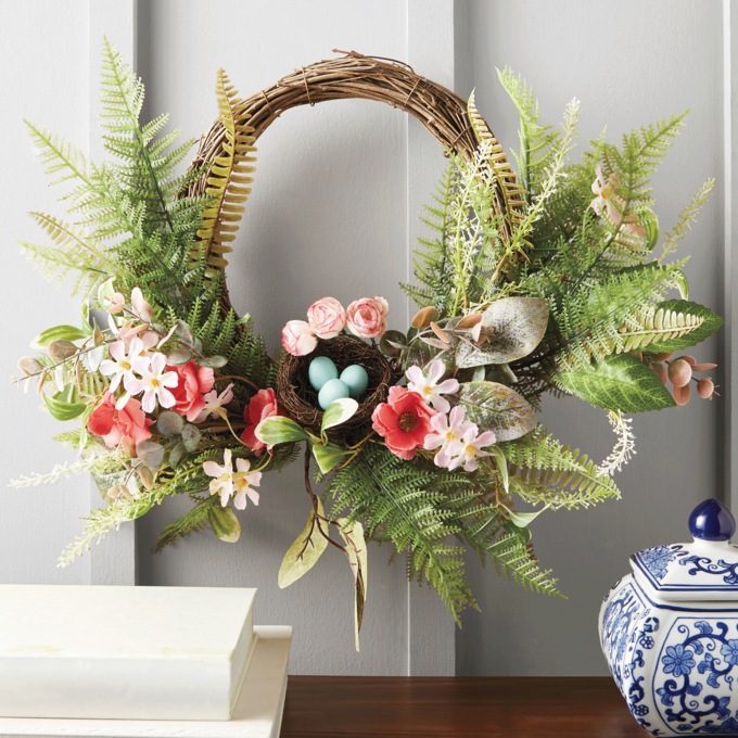 A most artful way to decorate your nest. Faux ferns and blooms draw the eye to a natural twig nest with foam eggs. Natural branch wreath. 23" w x 16" h x 5.5" d.