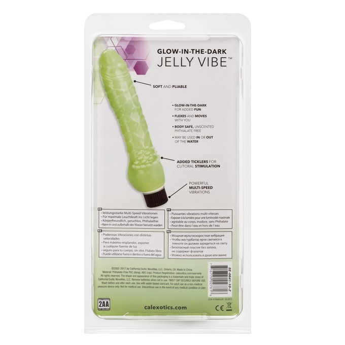 Jelly soft, pleasingly textured—and for extra spice, this multi-speed vibrator glows in the dark! So pliable, it flexes to move with you, while nubby ticklers at the base enhance clitoral stimulation. Realistic contours, down to its veined texture. Designed for internal and external use. Easy twist control to select your speed of choice. Waterproof. PVC. Uses 2 AA batteries (not included). 7" l x 1 ¼" diam.