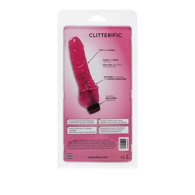 At 8" long and more than 2" in diameter, this powerful, pliable vibrator delivers highly fulfilling experiences. With multi-speed vibrations and a soft, flexible, life-like feel, plus a textured base for enhanced clitoral stimulation. Waterproof. PVC. Uses 2 AA batteries (not included). 8" l x 2 ¼" diam.