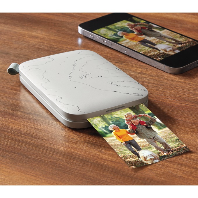 The easy, portable—and entirely wireless—solution for printing photos directly from your phone! PLUS they're 30% larger than typical 2x3 prints. Use free downloadable smartphone app (iOS/Android) to set up printer in seconds, then edit photos and add stickers. Uses Bluetooth and Wi-Fi. Rechargeable battery, with USB power cord. Comes with 10 starter sheets of sticky-backed Sprocket photo paper. 3.5" w x .75" h x 5" d.