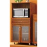 Elegant, smart kitchen storage with built-in 2-plug charging outlet, 1 pullout shelf and 1 drawer. Glass cabinet has 1 adjustable shelf. Four wheels (2 locking). Composite wood with wood veneer. No-tool assembly. 24" w x 47.75" h x 16" d.