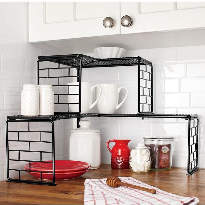 Turn an unused corner into a functional storage space! Perfect for spices, tea, mugs and more! Iron with durable powder-coated black finish. Assembly required. 25" w x 14 1/2" h x 17" d.
