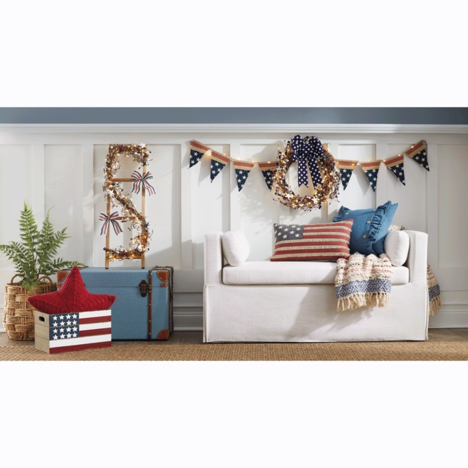 Natural twigs and vines in on a graceful wire curve; red/white/blue foam faux berries and stars. 30 warm white lights use 2 AA batteries (not included). Solid wood ladder, fabric bows. 12" w x 30" h.