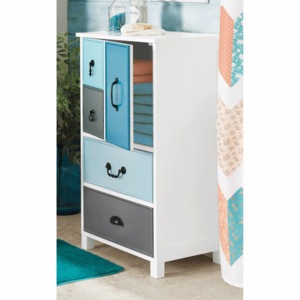 Good-bye, boring bathroom! Add interest AND storage with this mashup of varied colors, shapes and hardware. Composite wood. Assembly required.