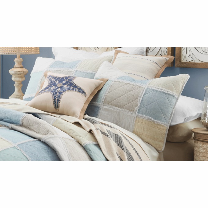 A tranquil field of soft, misty-color blocks create a soothing coastal setting. Diamond quilting front and back; white reverse. Cotton; machine wash. Imported.