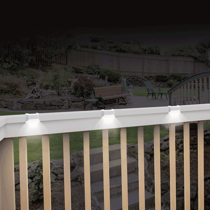 Light up steps, railings or deck edges with this set of 3 solar lights (1 warm white LED per light). 3.25" w x 1.75" h x 2" d each.