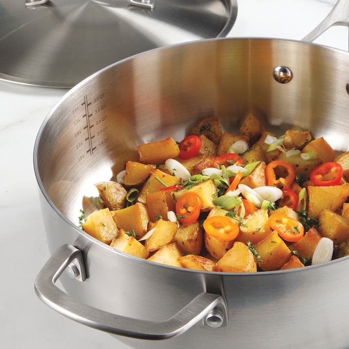 Sauté, braise, reduce and bake—all in one set! Includes 2- and 3.5-qt. saucepans with lids, 4.5-qt. sauté pan with lid, 6-qt. Dutch oven with lid, and 8" and 10" fry pans. Tri-ply stainless steel with aluminum core. Riveted handles. Compatible with all stovetops, including induction. Oven, broiler and dishwasher safe.