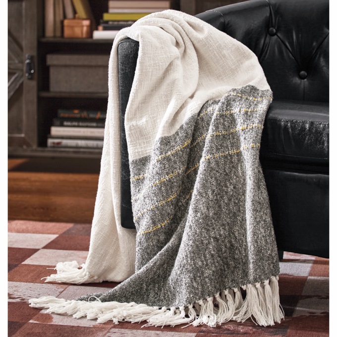 Modern look or texture appeal, this throw with its gray, white and gold band catches the eye. Knotted fringe on top and bottom. Cotton/acrylic/other fiber; spot clean. Imported. 50" x 61". Gray/Gold.